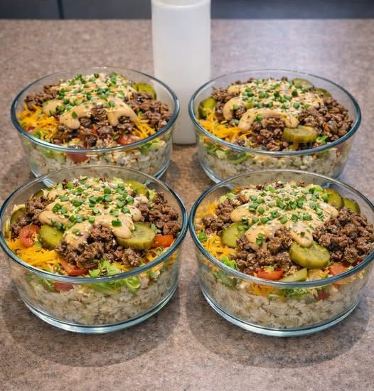 In this recipe, the burger bun is removed and all the classic burger ingredients are served in a bowl. You